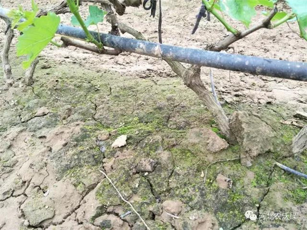 去年秋天葡萄小鎮(zhèn)的部分種植戶來到農(nóng)大實驗站,聽取農(nóng)業(yè)專家講解葡萄管理技術,講解了他們這種傳統(tǒng)種植方法的弊端,不腐熟的農(nóng)家肥和劣質有機肥不僅會對做物造成燒苗,還會帶入大量病菌造成作物土傳病害嚴重,使土壤板結和鹽漬化,作物不能正常生長,最終導致減產(chǎn)。如下圖,地表長綠苔,PH值在8.5,偏堿,超出葡萄正常生長范圍