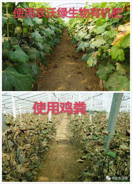 下圖是廣宗的種植戶在給葡萄施用月子肥時的情形,施用雞糞的棚室由于受氨氣毒害葉片干焦,大家都知道葡萄在這個時期葉片需要為葡萄來年生長積蓄養(yǎng)份,但是由于受到氨氣毒害葉片失綠干枯,將會影響下一季的產(chǎn)量造成減產(chǎn)使種植戶遭受損失。但使用農(nóng)沃綠生物有機肥棚室葉片依然翠綠,葡萄的生命力旺盛,植株營養(yǎng)充足預示著來年的豐收,使用農(nóng)沃綠蚓菌多生物有機肥不燒苗、安全性高,是作物豐收的保證。此消彼長因此使用農(nóng)沃綠蚓菌多生物有機肥是農(nóng)戶更好的選擇。