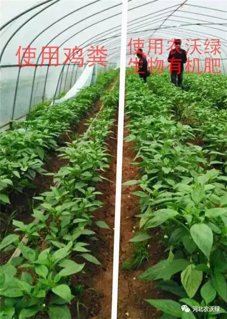 在青椒上使用農(nóng)沃綠蚓菌多生物有機肥和使用雞糞的相對比長勢更旺,植株健壯。長勢也均勻。沒有大小棵。