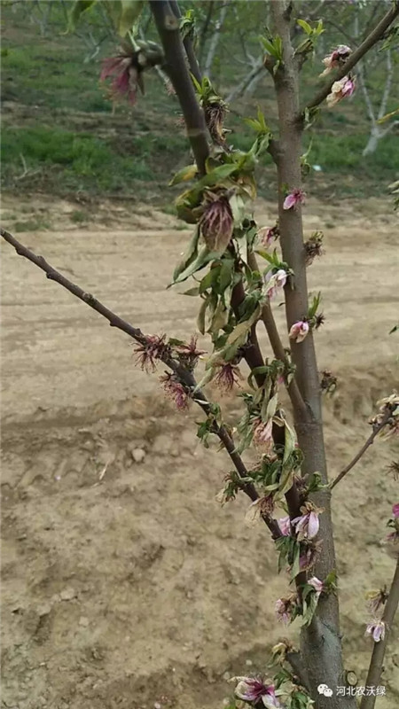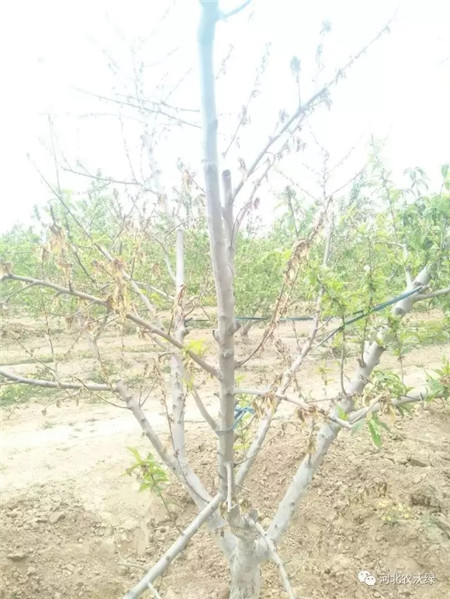 下圖是第一次灌根后又新發(fā)病的桃樹,屬于花期過后的發(fā)病,沒有及時處理。
