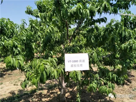 灌根處理后,原來沒發(fā)病的桃樹陸續(xù)又有的開始發(fā)病,桃樹的枝葉開始發(fā)黃枯萎,長勢弱,沒有坐果,病害還在蔓延。為了消除整個桃園土壤有害病菌,用農(nóng)沃綠VT-1000菌液在澆水的時候沖施到果園,畝用菌液2公斤。張社長還把農(nóng)沃綠VT-1000菌液推薦給了其他果農(nóng),說我們的產(chǎn)品效果這么好,一定要讓更多人知道,讓大家都用上好產(chǎn)品。