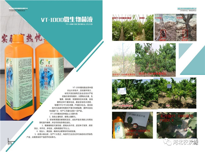因此,在果園施肥上提倡生物有機肥與無機肥相結(jié)合結(jié)合,單一依靠大化肥的施肥方式持續(xù)得越久,對果園土壤的傷害越嚴(yán)重,對土壤問題嚴(yán)重的果園,應(yīng)使用VT-1000菌劑進(jìn)行沖施,VT-1000菌劑是應(yīng)用中國農(nóng)業(yè)大學(xué)技術(shù)歷經(jīng)數(shù)年研制而成,每毫升不少于10億活菌,使用后可以起到改良果園土壤的作用,促進(jìn)土壤團(tuán)粒化保水保肥,還能抑制雜草滋生,提高果樹的抗病能力。增施生物有機肥,提高土壤有機質(zhì),改良土壤環(huán)境是果園施肥的發(fā)展方向。