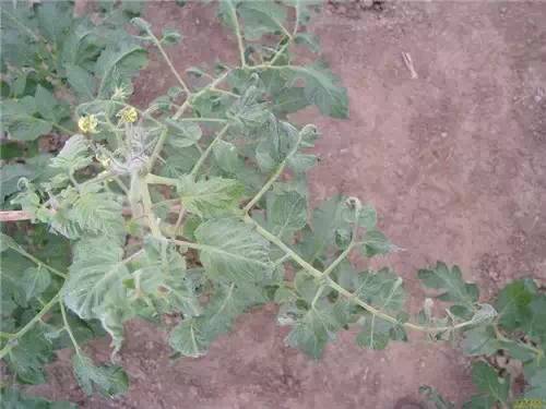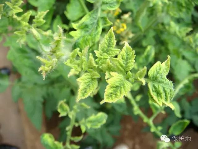 番茄頂部葉片發(fā)黃,為整個(gè)葉片發(fā)黃,顏色為淺黃色,包括葉片及葉脈,葉片變薄變小。