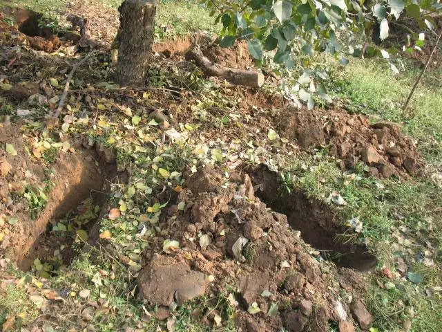 以樹干為中心,距樹1m處開始,向外成放射狀挖4~8條施肥溝,長達(dá)樹冠內(nèi)外50cm,溝深要求近樹干處為15cm,向外逐漸深至50cm,此法適用于成年果樹。