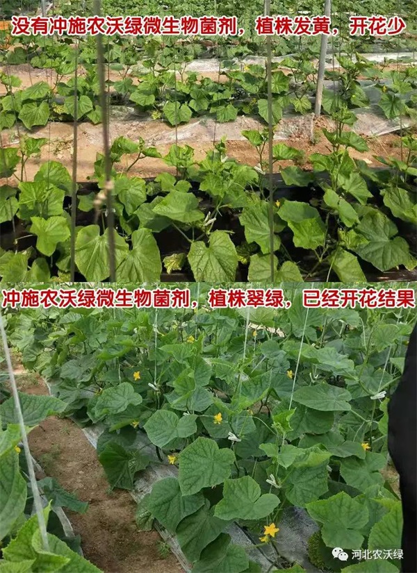 確定原因后,公司經(jīng)理建議沖施農(nóng)沃綠微生物菌劑,一畝地沖施一壺,改善土壤透氣性,促進(jìn)瓜苗生長(zhǎng),當(dāng)天下午在公司經(jīng)理的指導(dǎo)下就沖施上了。近期,我們又來(lái)到張大哥的大棚,再次相見(jiàn),張大哥完全沒(méi)有了之前的愁容滿(mǎn)面,一臉高興啊,再看棚內(nèi)情況,瓜苗綠油油的長(zhǎng)勢(shì)特別旺盛,莖稈粗壯,刨開(kāi)根部,毛細(xì)根數(shù)量明顯增多,而且根系發(fā)達(dá)。張大哥說(shuō):“沖施你們這個(gè)微生物菌劑后,我天天觀察,大概在5.6天的時(shí)候發(fā)現(xiàn)已經(jīng)有新葉開(kāi)始生長(zhǎng)了,刨開(kāi)根部,已經(jīng)滋生了很多毛細(xì)根,之后一直觀察,到現(xiàn)在植株翠綠,很健康,甚至比另一側(cè)的開(kāi)花還要早還要多呢”。