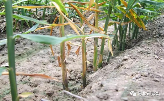 大姜莖基腐病俗稱爛脖子,是一種真菌性病害,主要在高溫高濕的情況發(fā)生較為嚴重,以菌絲體在病株殘體中和染病姜塊中或土壤中越冬。該病主要危害莖桿,使水分養(yǎng)分運輸受阻,莖桿由上到下干枯死亡,造成死棵現(xiàn)象。