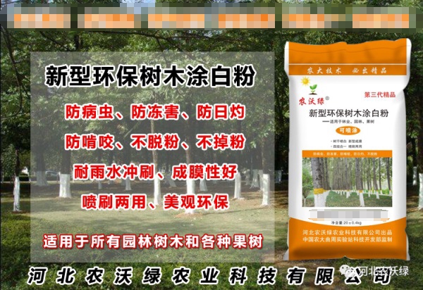樹干涂白是防治病蟲害及植物生理性病害很好的方法。農(nóng)沃綠第三代新型環(huán)保樹木涂白粉,防病蟲,防凍害,防日灼,防啃咬,噴涂兩用,使用方便,噴涂后不脫落不掉粉,成膜性極好,環(huán)保又美觀。