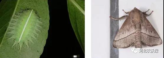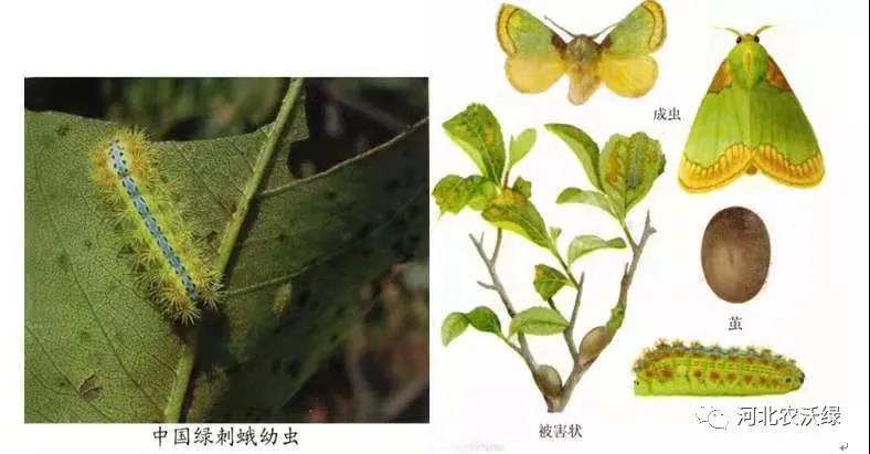 扁剌蛾:體扁、橢圓形,背部稍隆起,形似龜背。全體綠色或黃綠色,背線白色。體兩側(cè)各有10個(gè)瘤狀突起,其上生有刺毛,每--體節(jié)的背面有2小叢刺毛,第四節(jié)背面兩側(cè)各有-紅點(diǎn)。