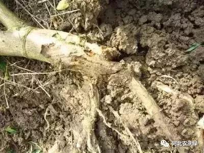 挖開表土露出根部,會(huì)發(fā)現(xiàn)大部分須根變褐枯死,粗根病部凹凸不平,有的病斑呈暗褐色,皮層腫脹呈潰瘍狀,手按可溢出濃褐色汁液,并伴隨異味。